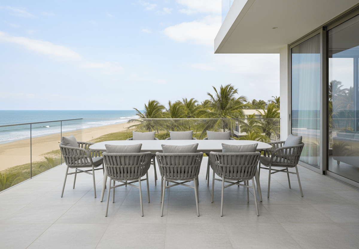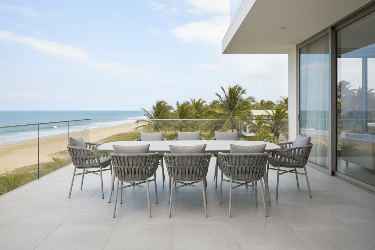 Materiales: Estructura aluminio, tablero de piedra sinterizada, trenzado y textil Textilene